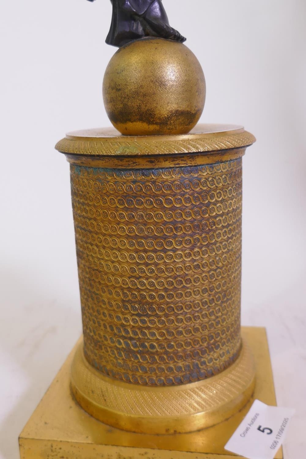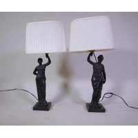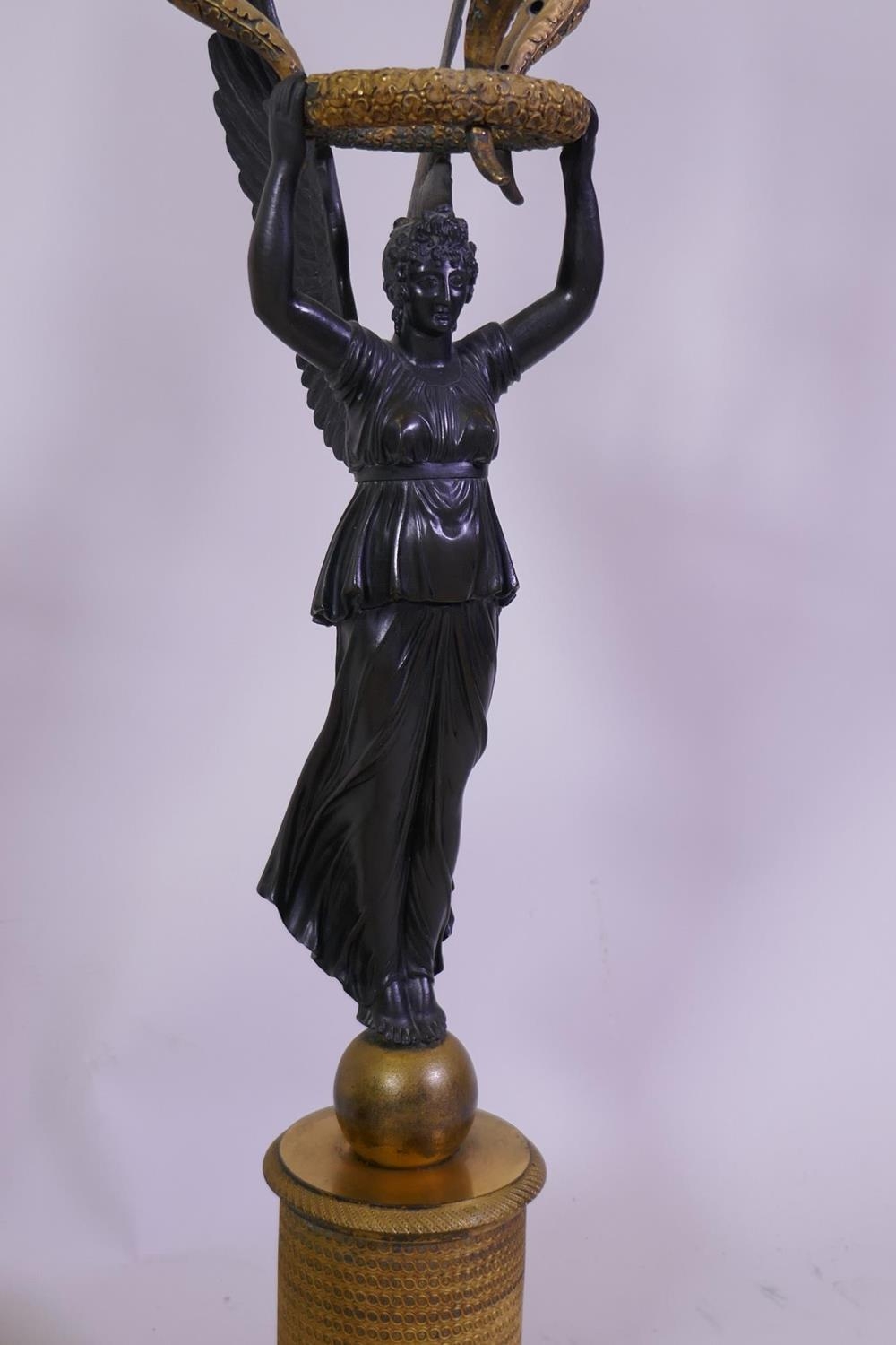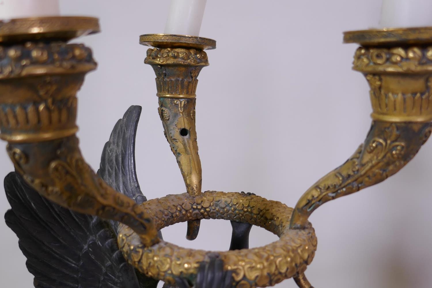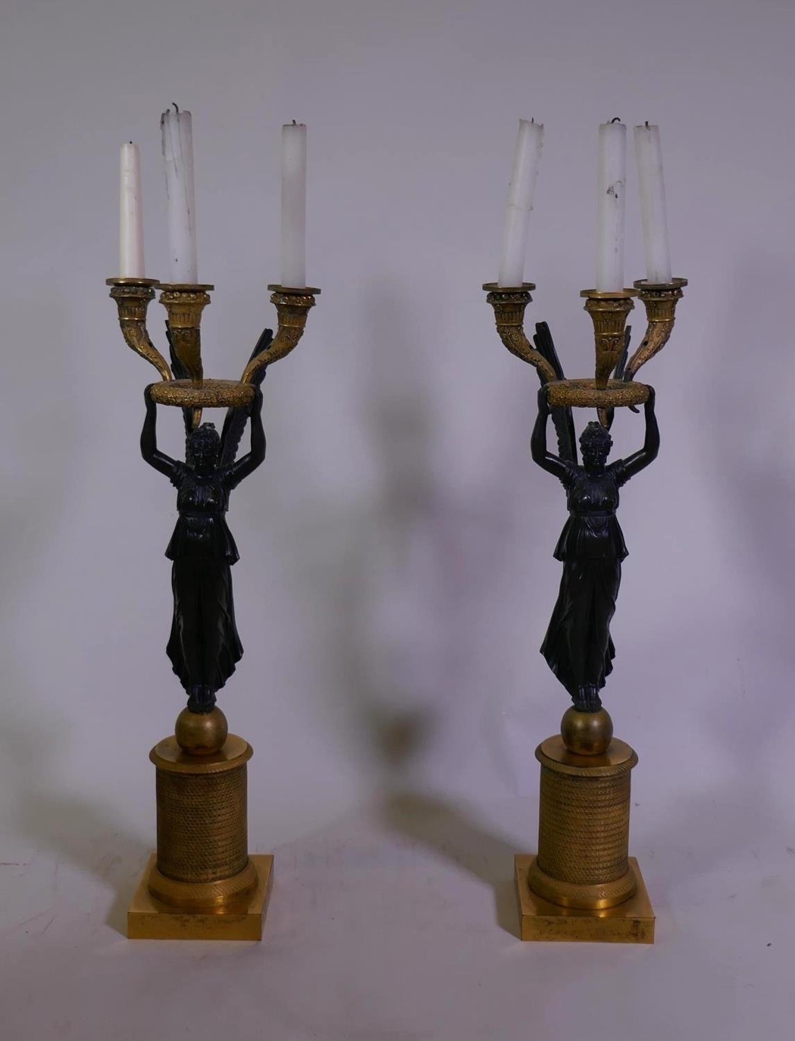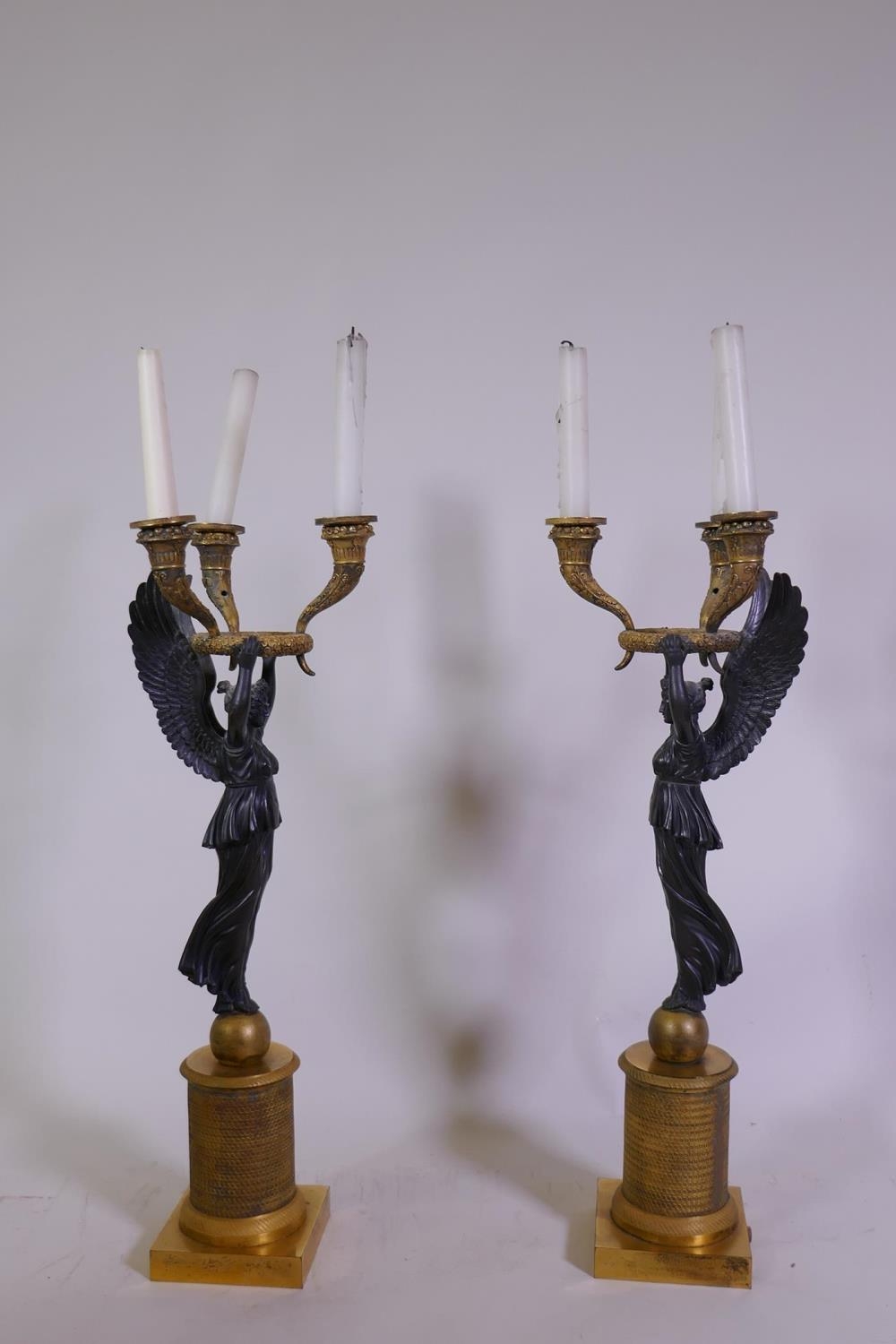 A pair of C19th French Empire style bronze and ormolu three branch candelabra in the form of winged angels, drilled for electricity, 60cm high
