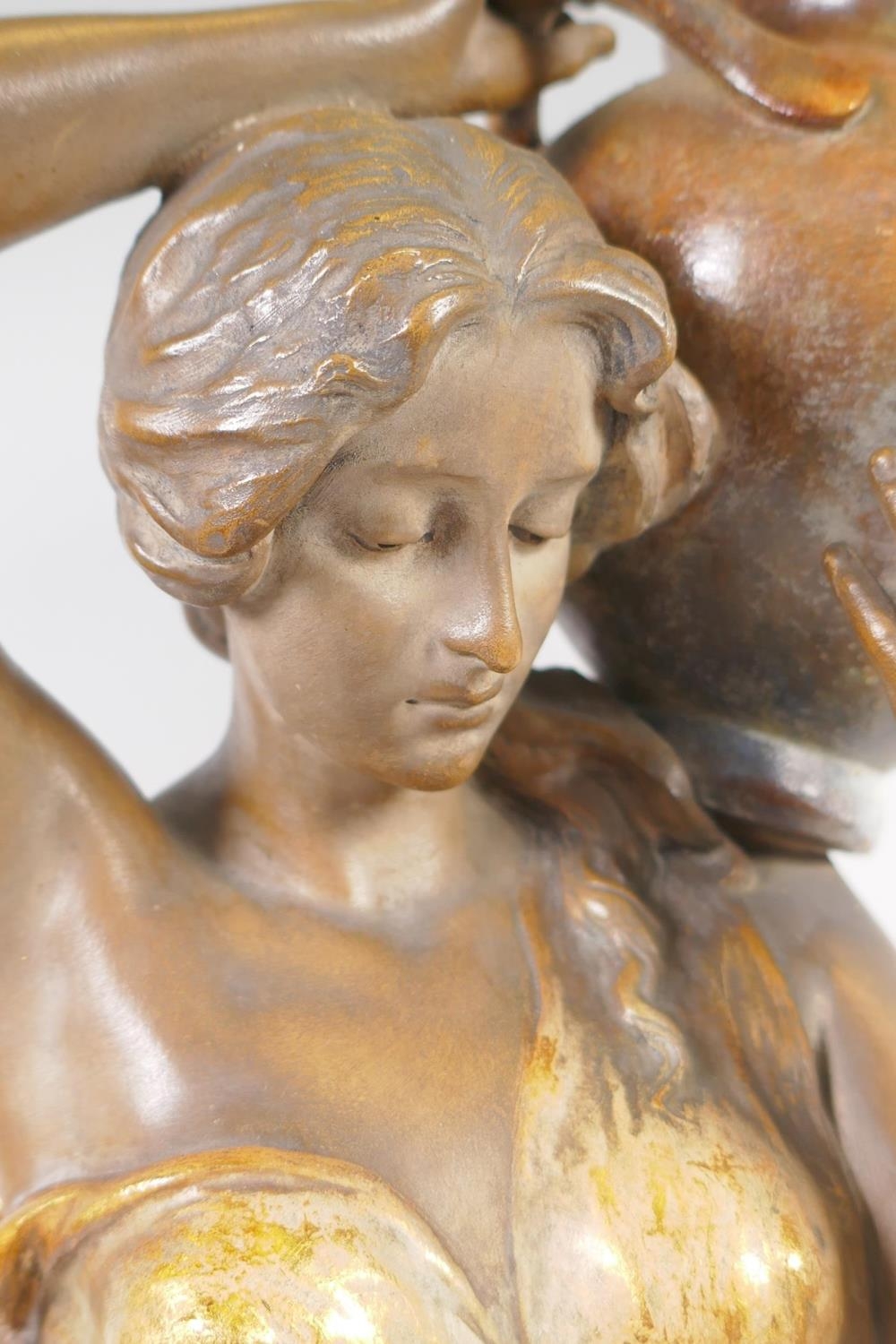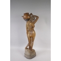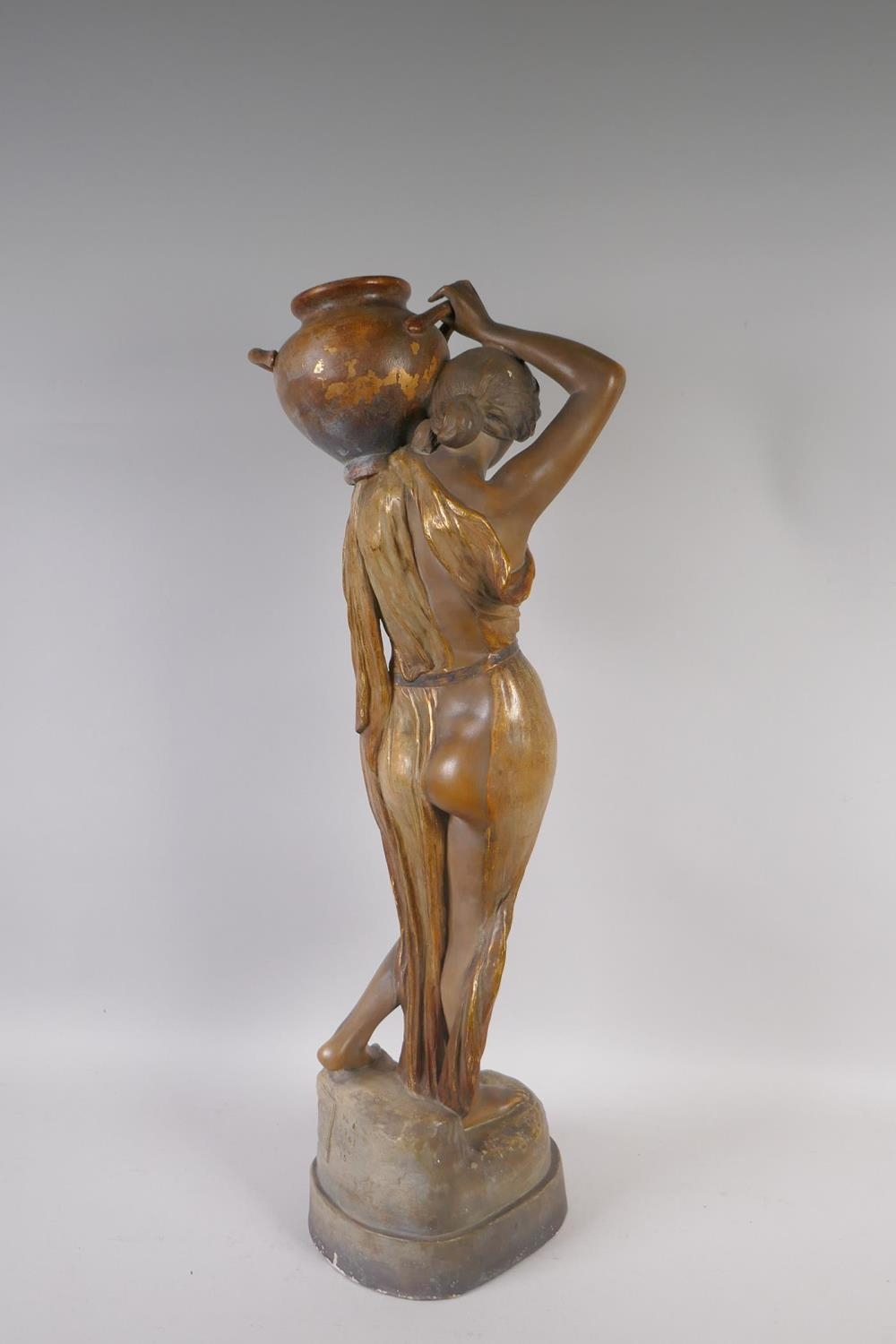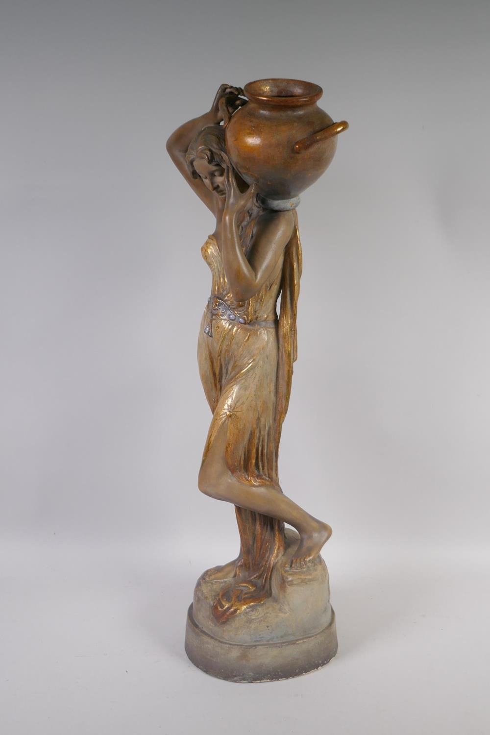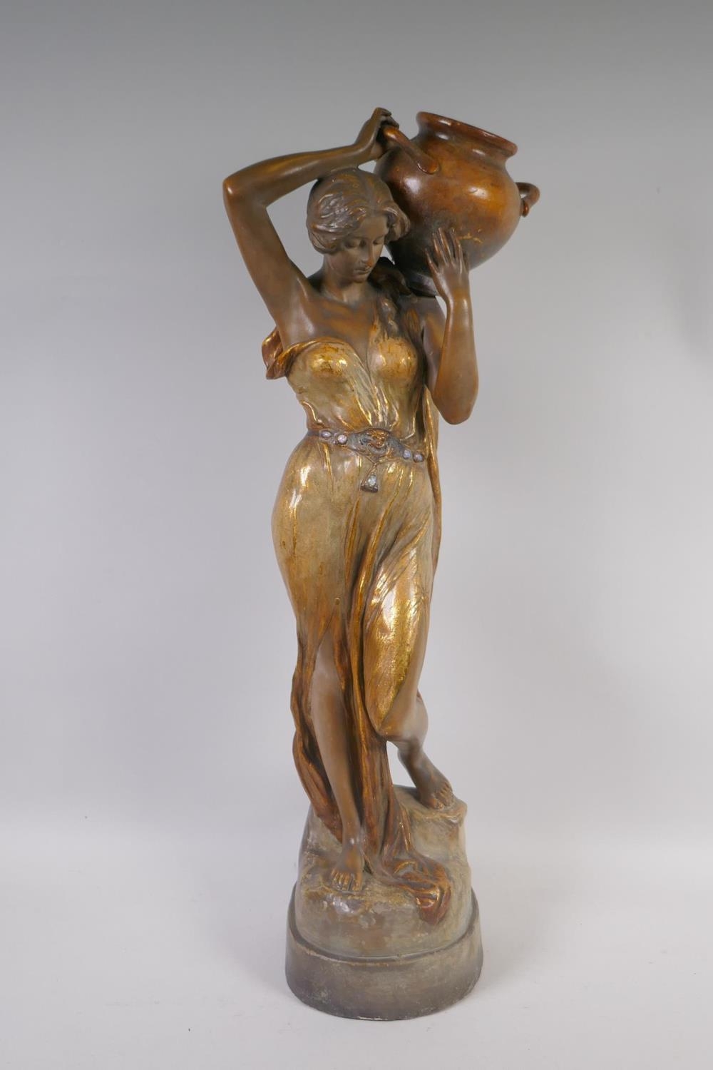A late C19th Austrian Goldscheider Art Nouveau terracotta figure of a female water carrier modelled by F. Gross, the waist belt of the figure set with five opal cabochons, signed to the reverse with a Goldscheider stamp and number 2741 409 15, 61cm high