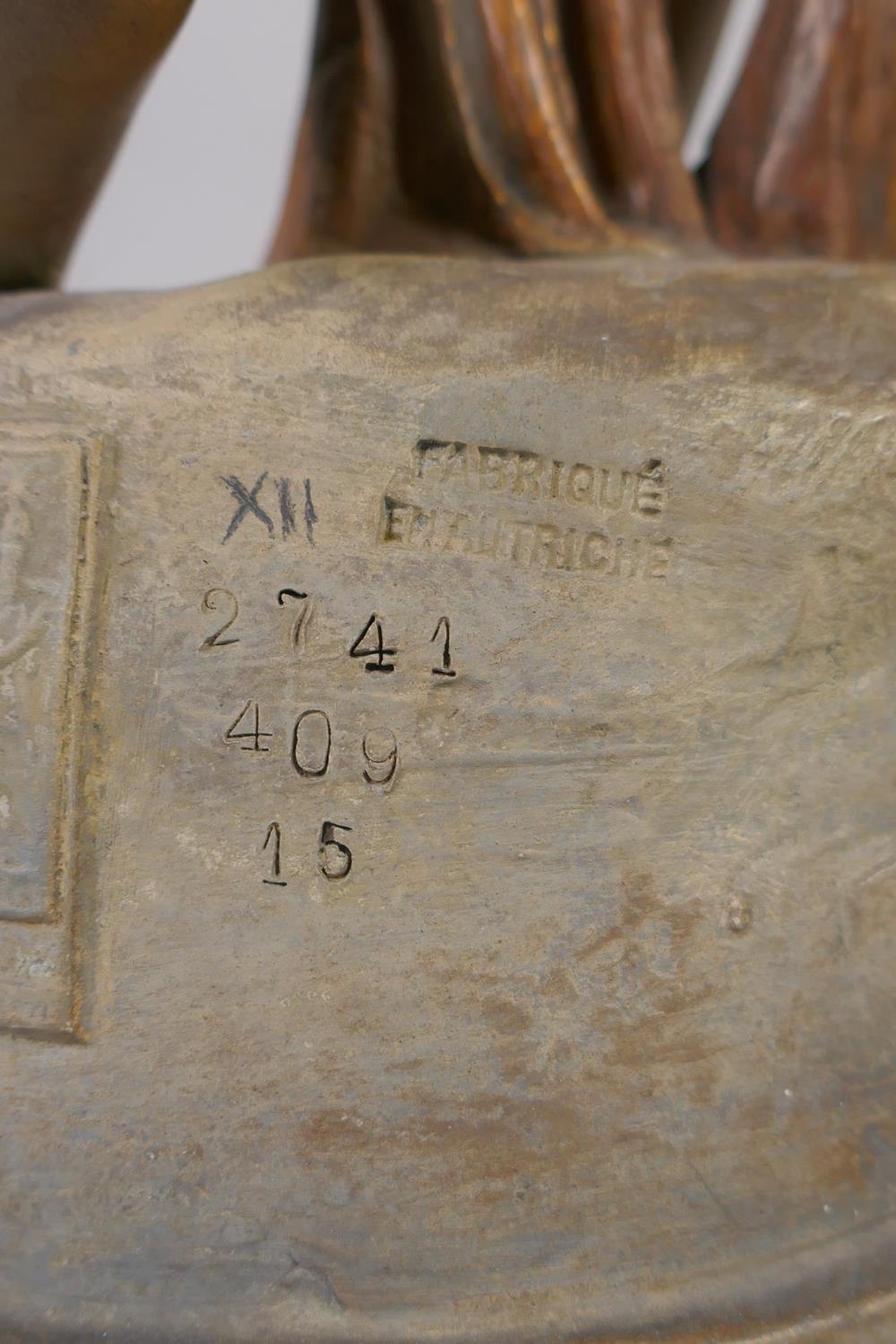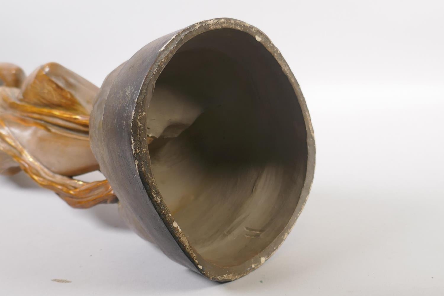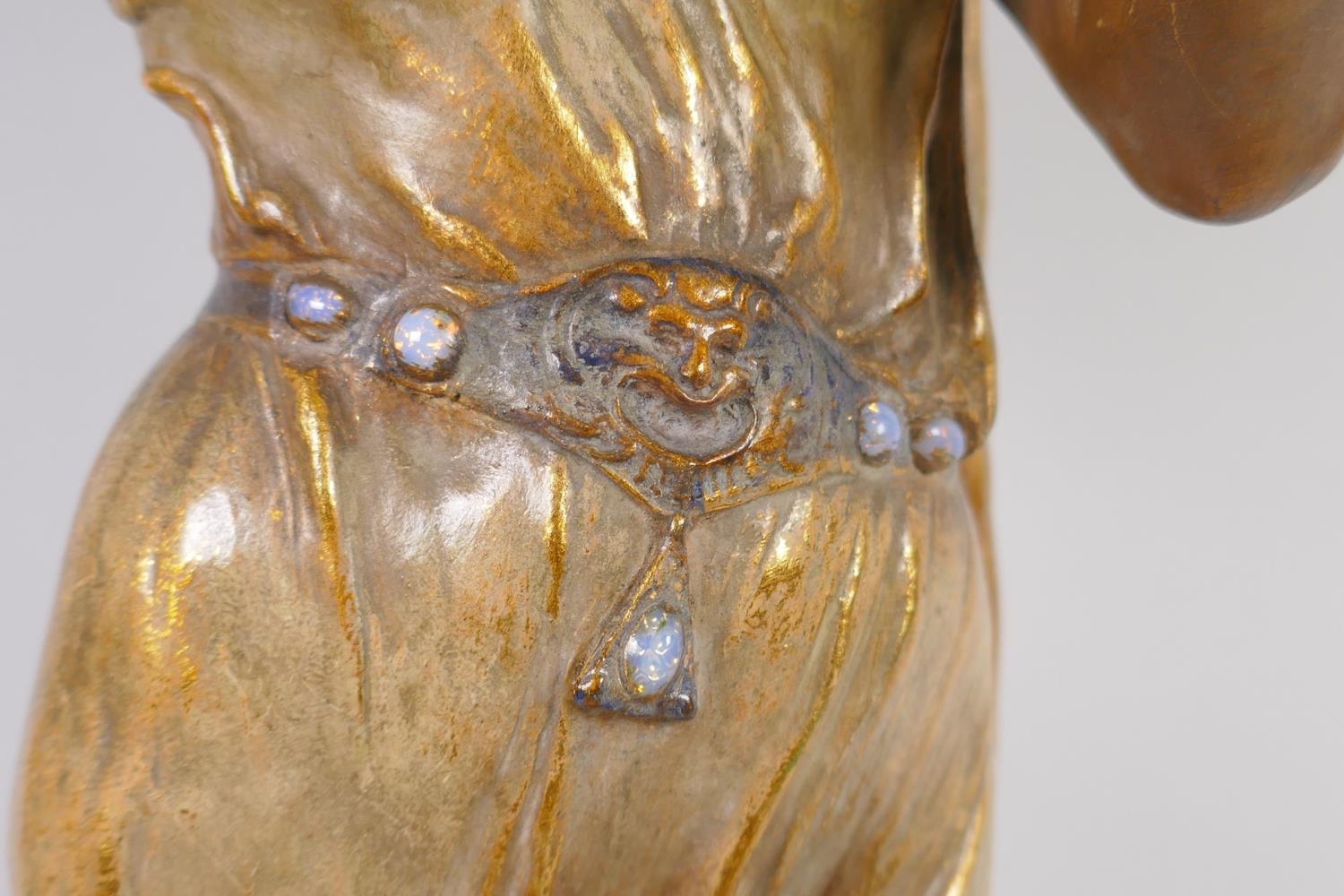 A late C19th Austrian Goldscheider Art Nouveau terracotta figure of a female water carrier modelled by F. Gross, the waist belt of the figure set with five opal cabochons, signed to the reverse with a Goldscheider stamp and number 2741 409 15, 61cm high