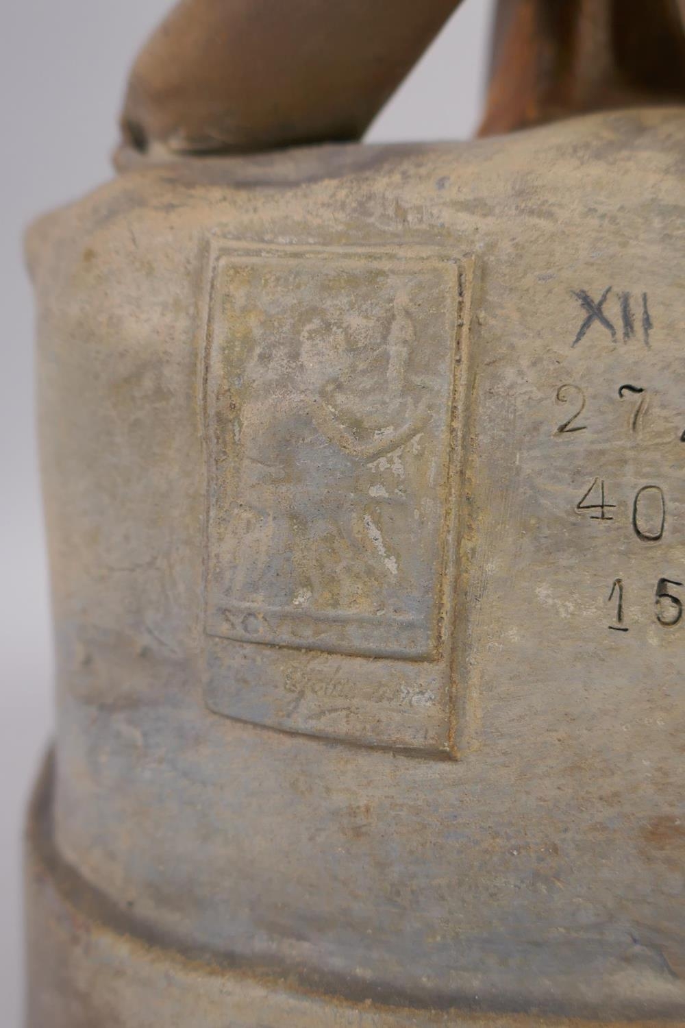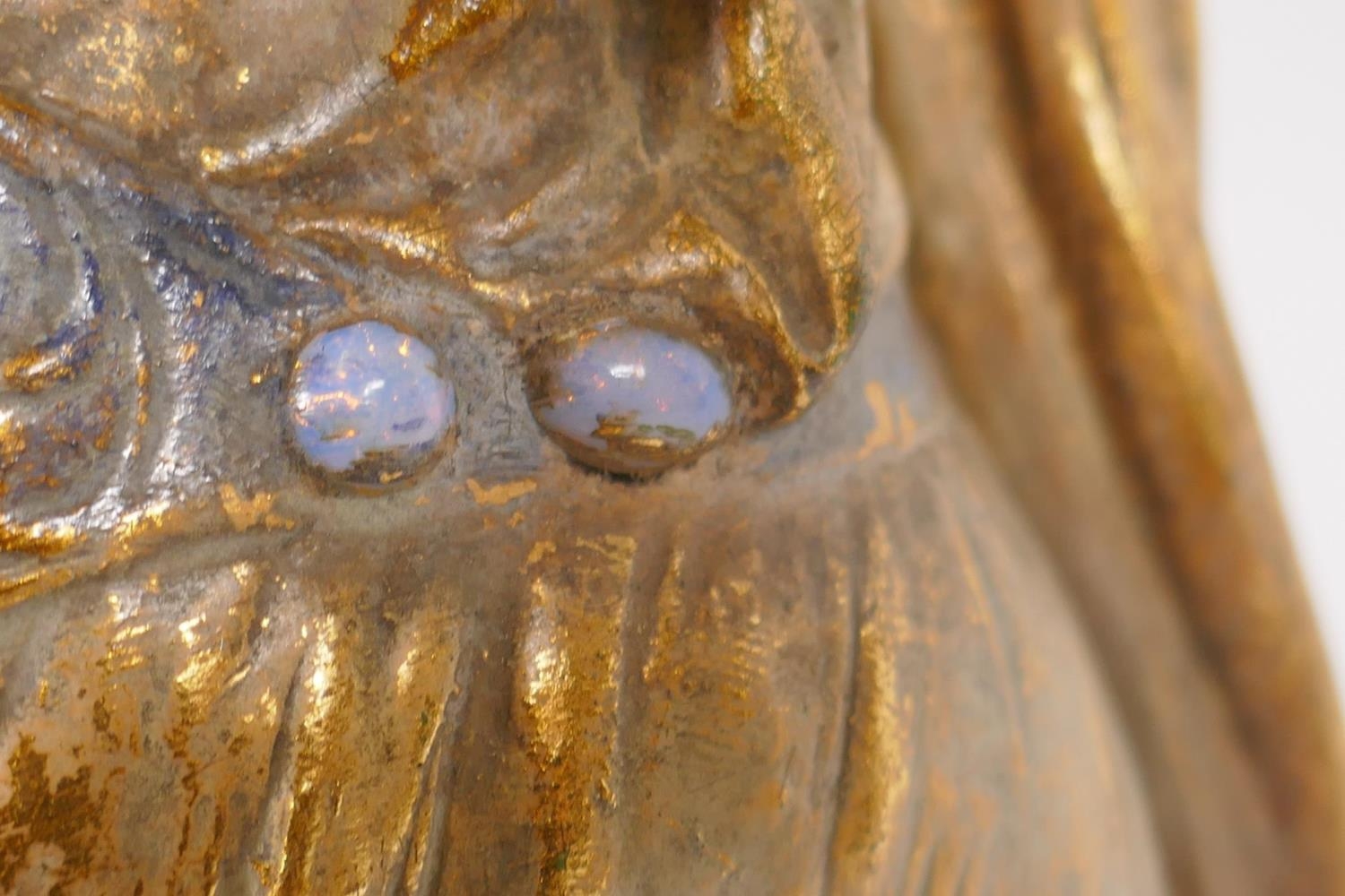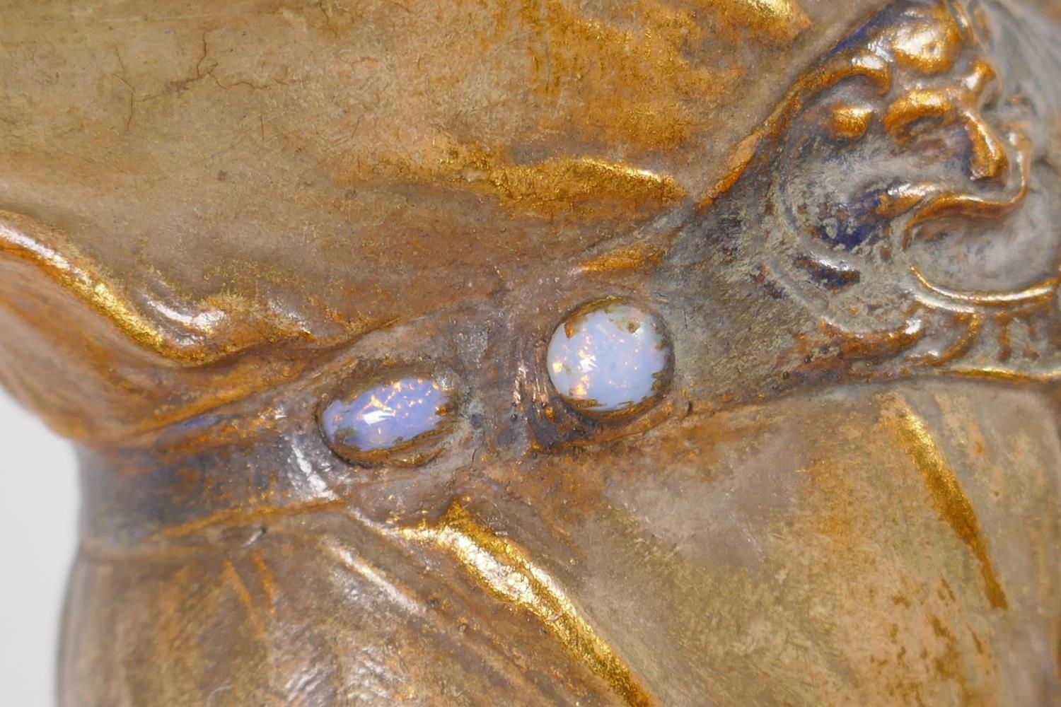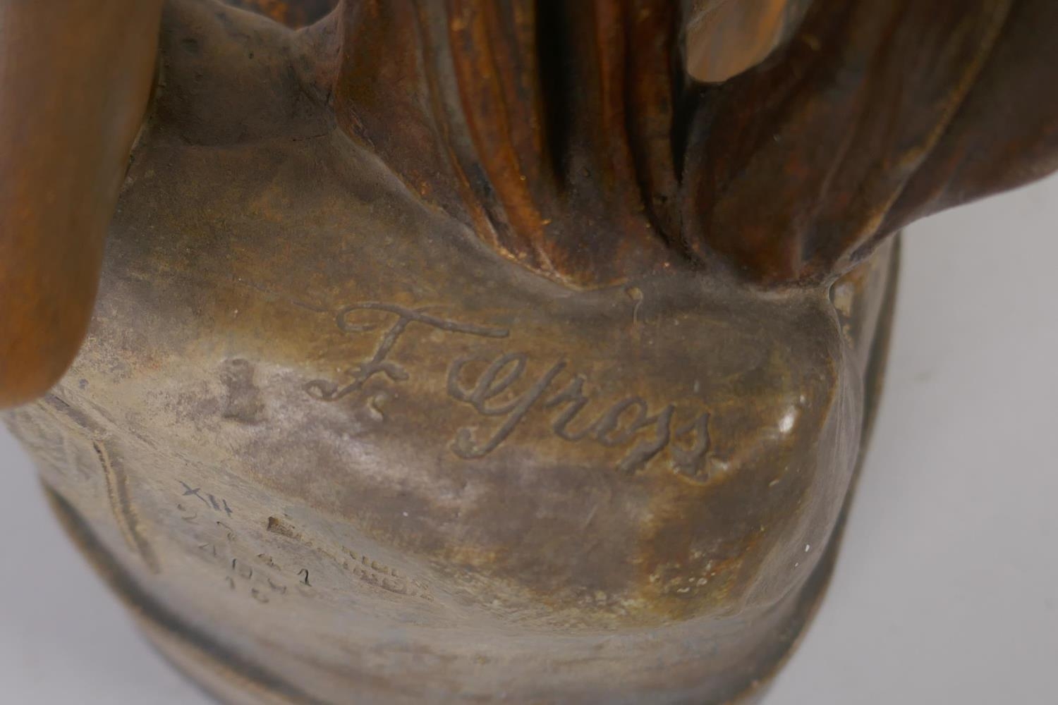 A late C19th Austrian Goldscheider Art Nouveau terracotta figure of a female water carrier modelled by F. Gross, the waist belt of the figure set with five opal cabochons, signed to the reverse with a Goldscheider stamp and number 2741 409 15, 61cm high