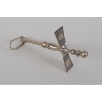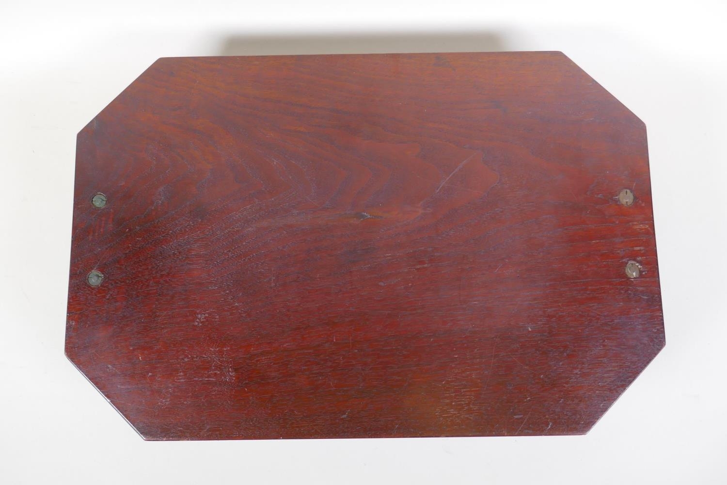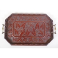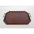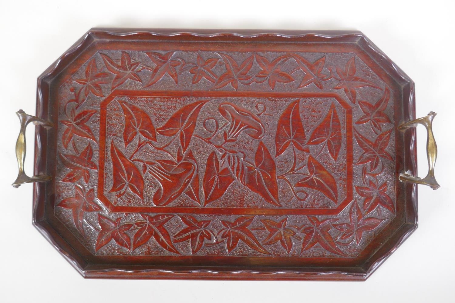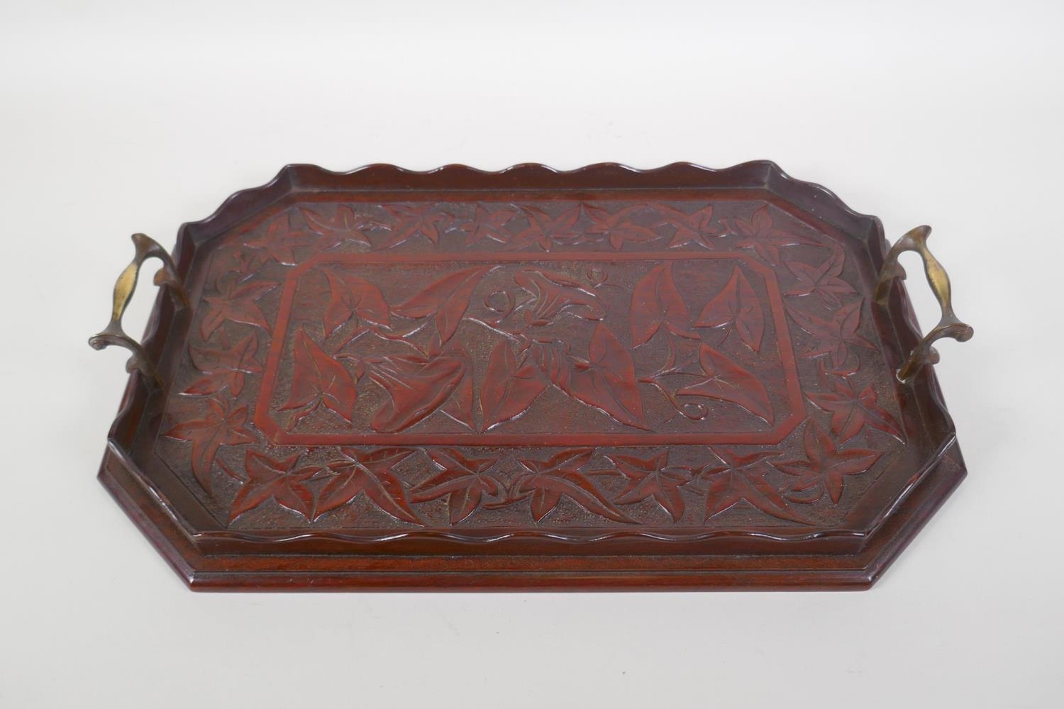 An Arts & Crafts walnut tray with carved vine decoration and brass handles, 30 x 46cm