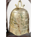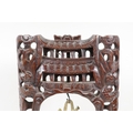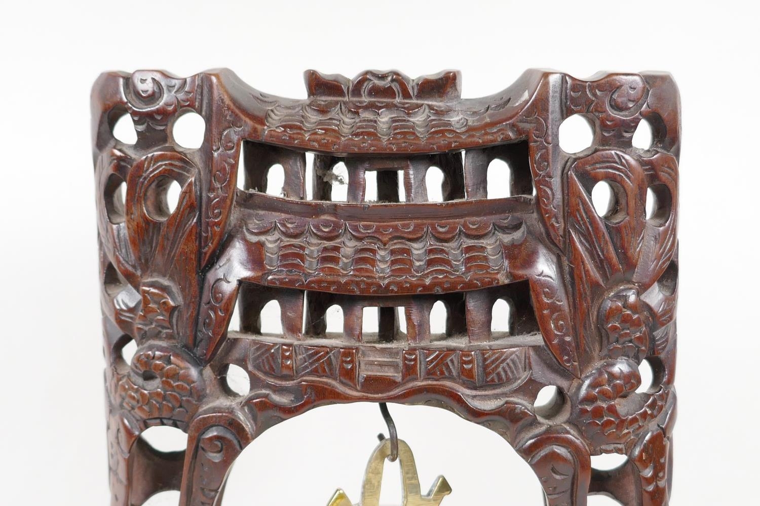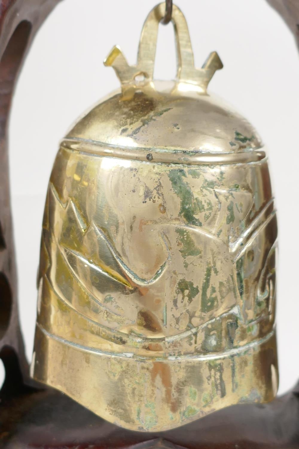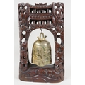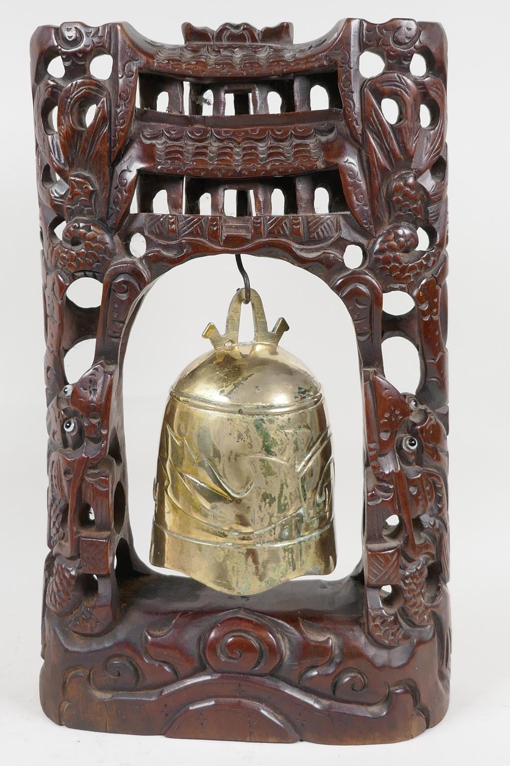 An oriental table gong with hardwood frame carved as dragons around a pagoda, with bell shaped gong, 13" high