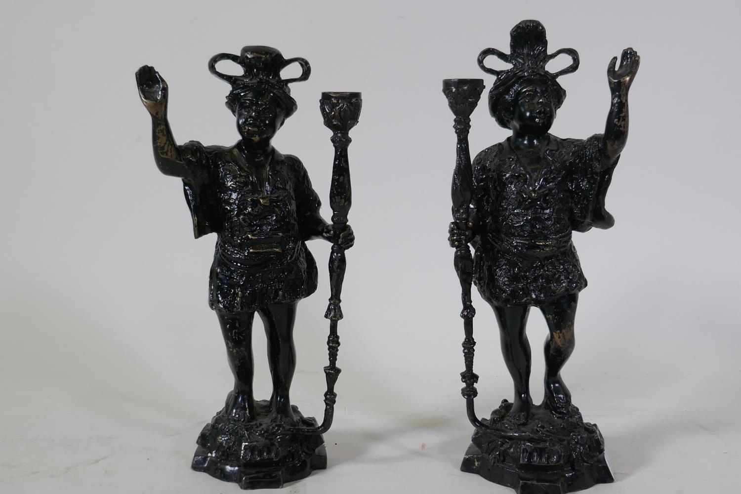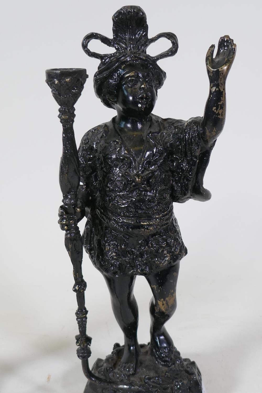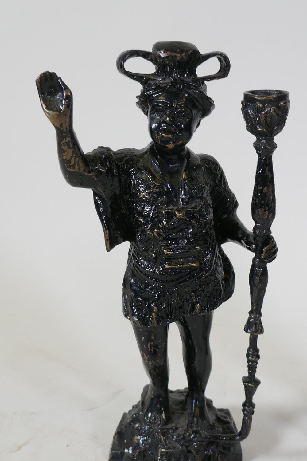 A pair of antique painted metal candlesticks in the form of blackamoors, 41cm high
