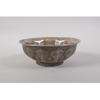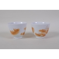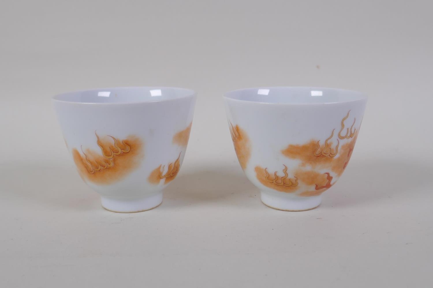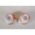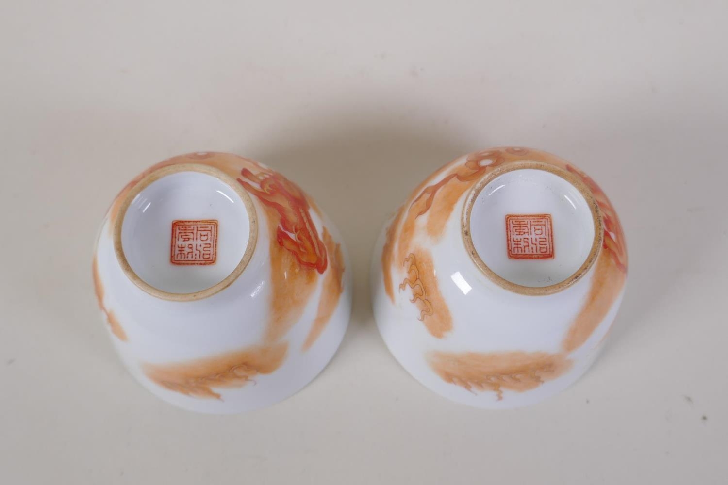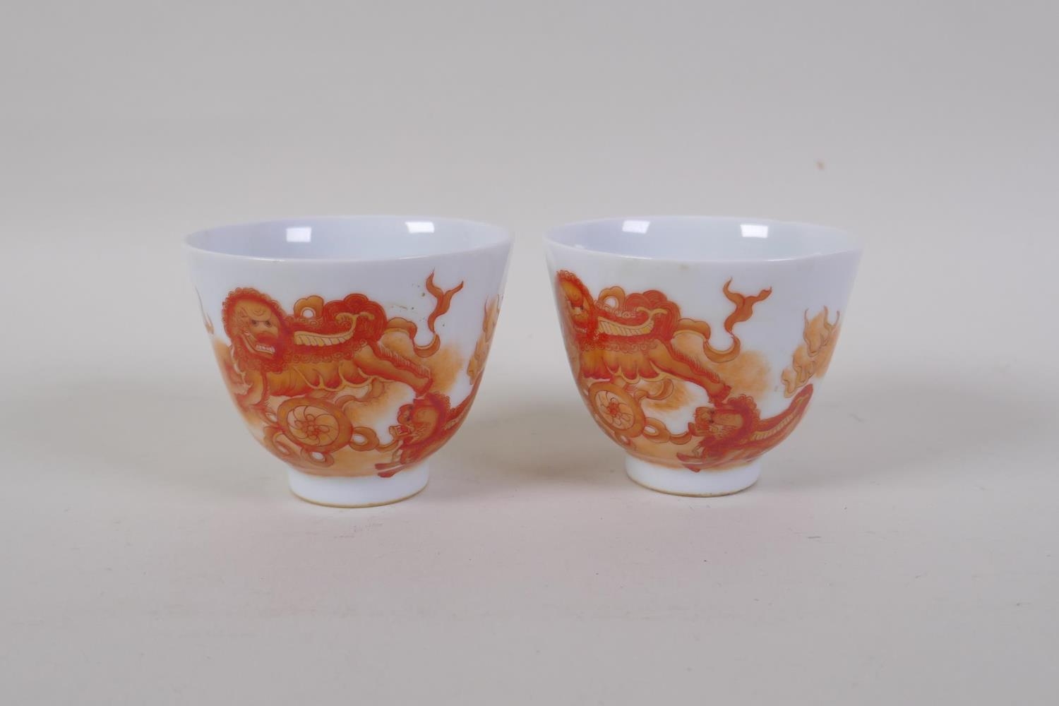 A pair of early C20th Chinese red and white porcelain tea bowls with fo dog decoration highlighted with gilt, seal mark to base, 6cm high