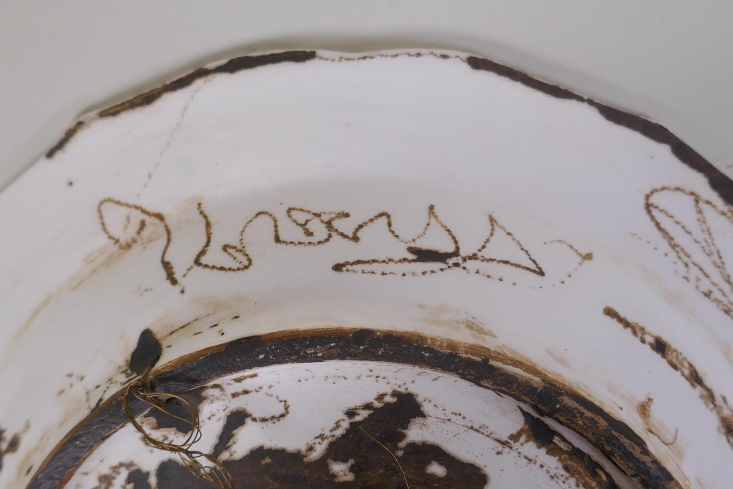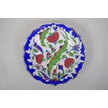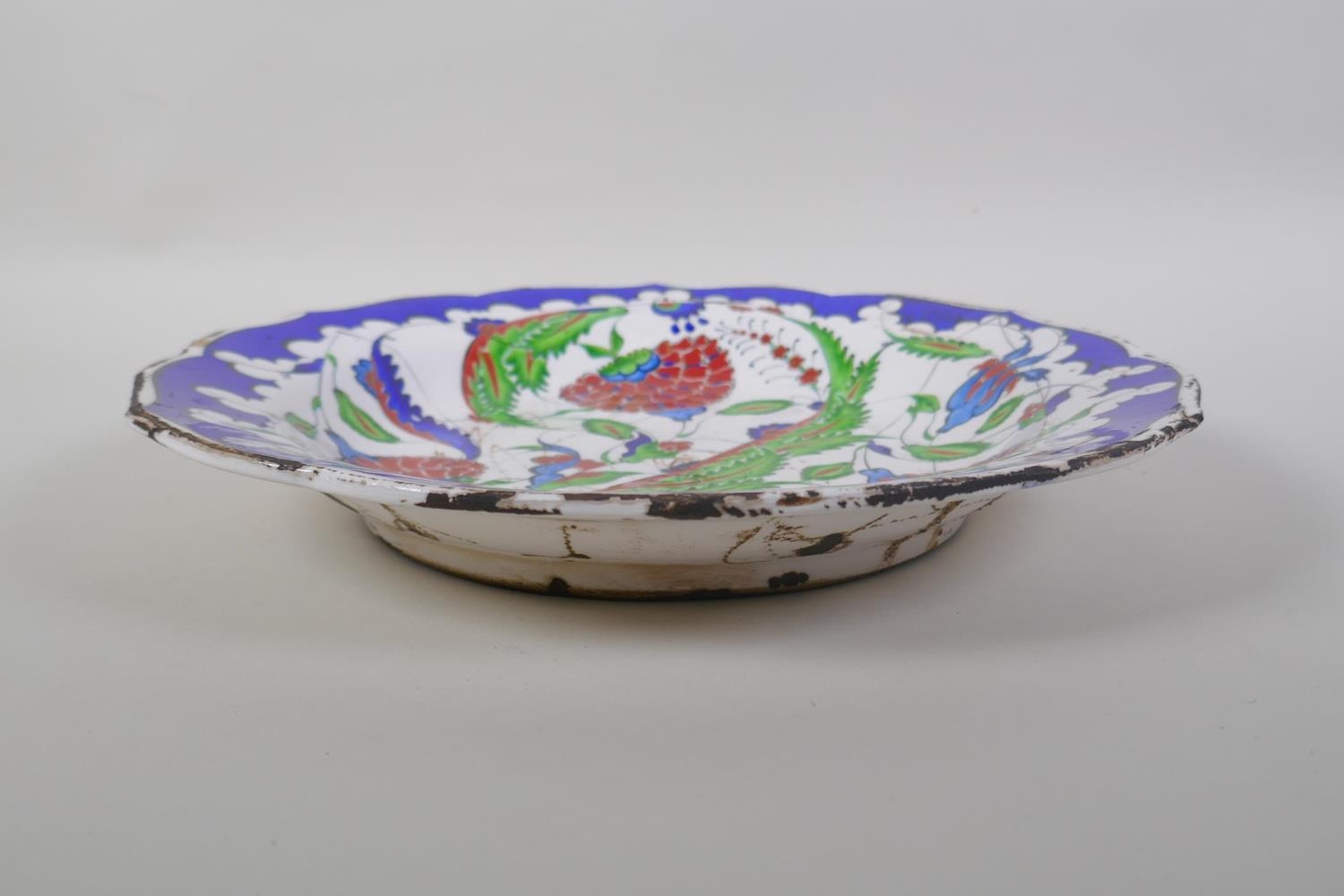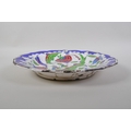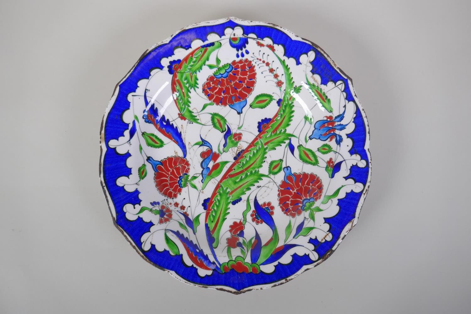 A continental polychrome faience porcelain charger with lobed rim, decorated with an Iznik style design, inscription to base, 31cm diameter