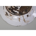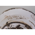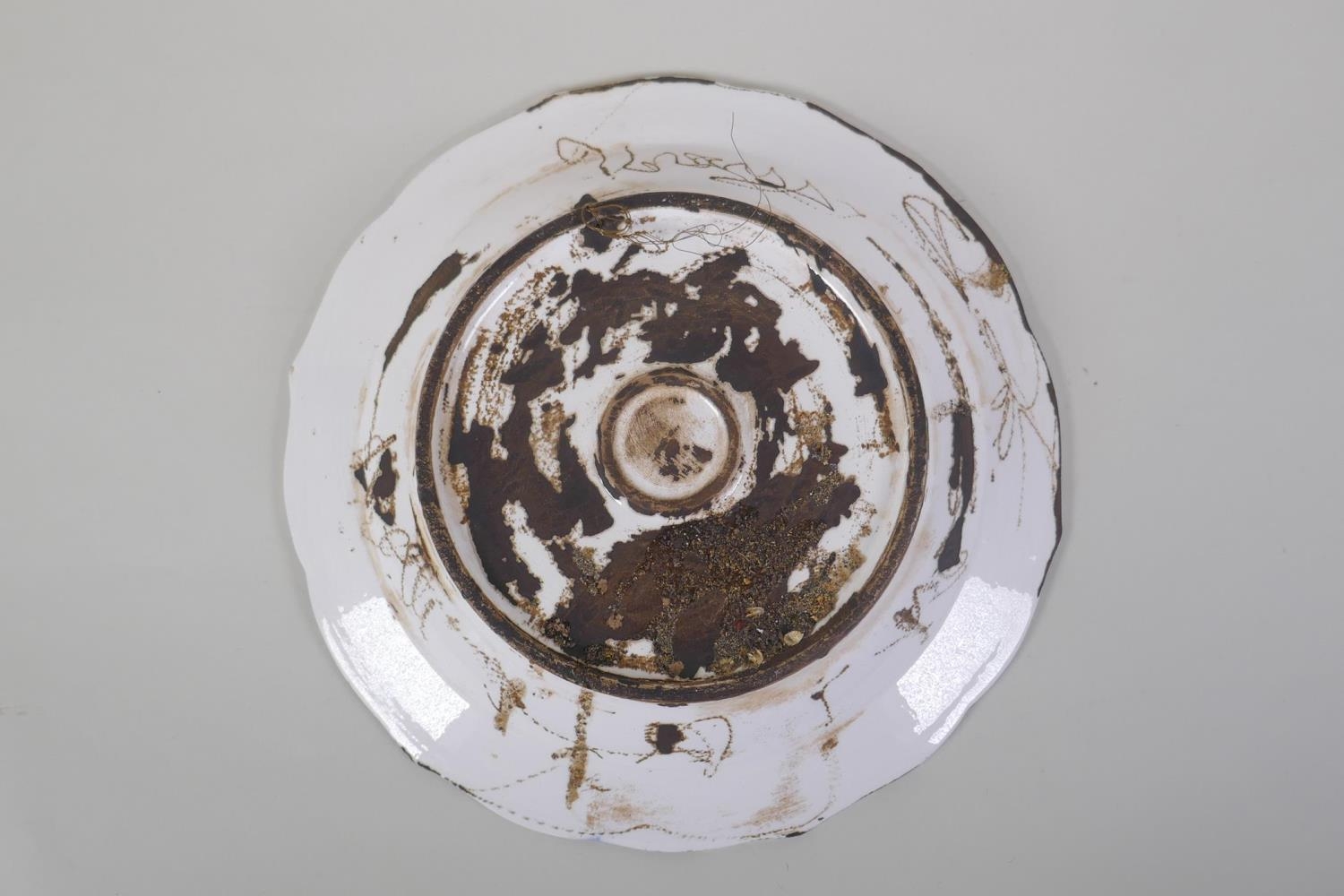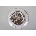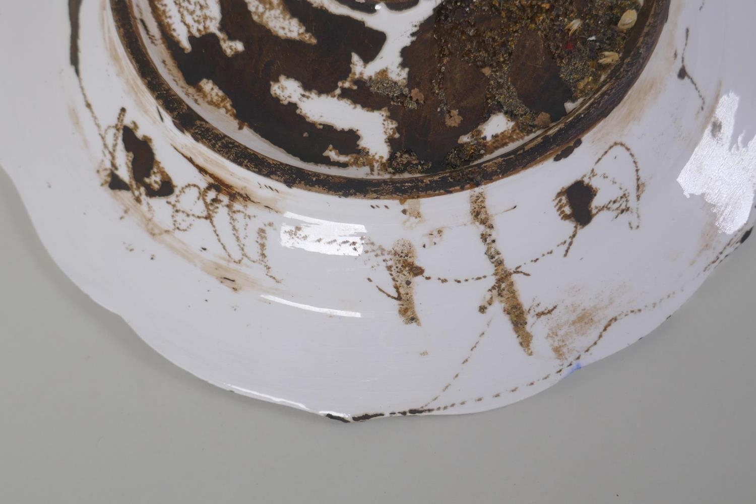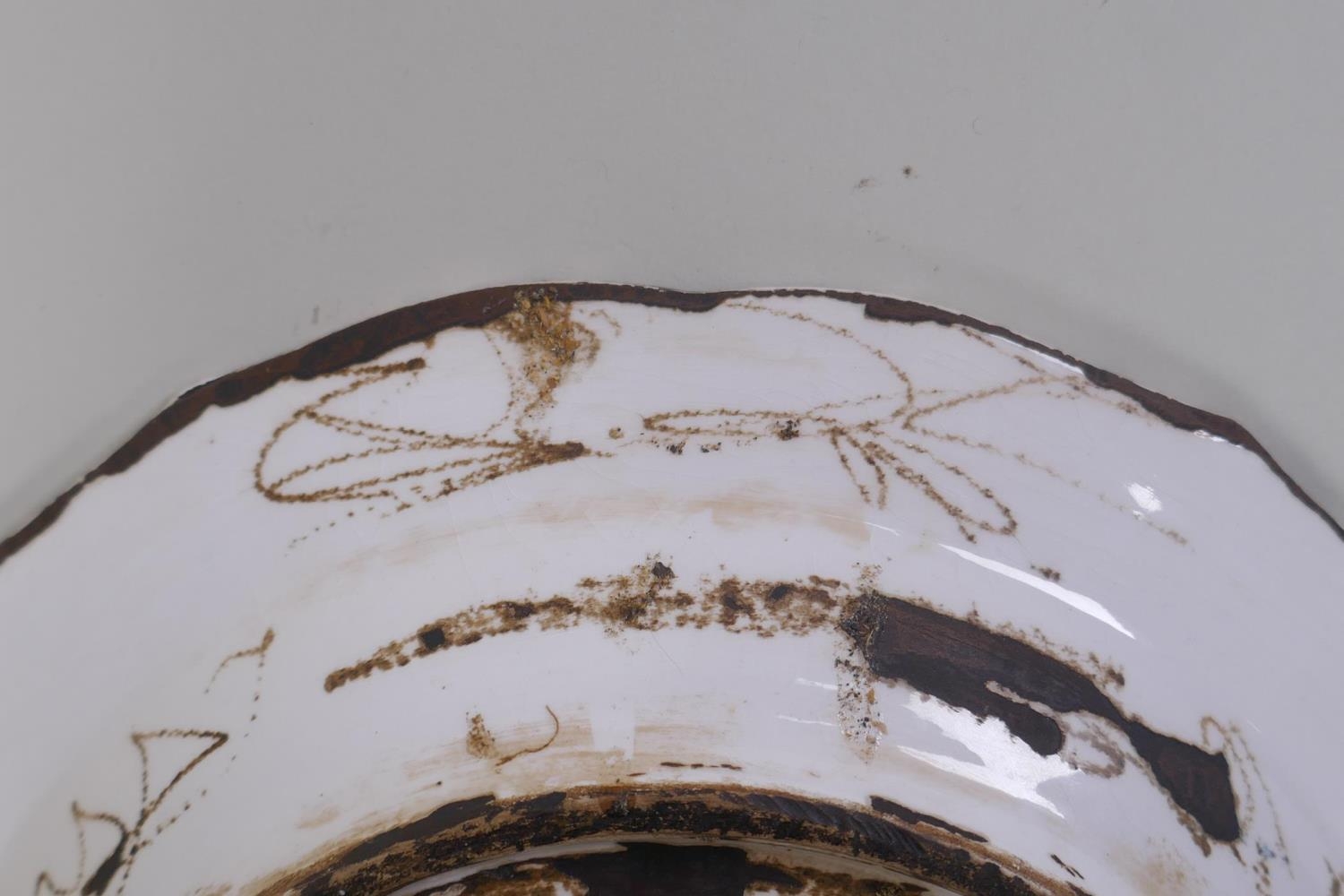 A continental polychrome faience porcelain charger with lobed rim, decorated with an Iznik style design, inscription to base, 31cm diameter