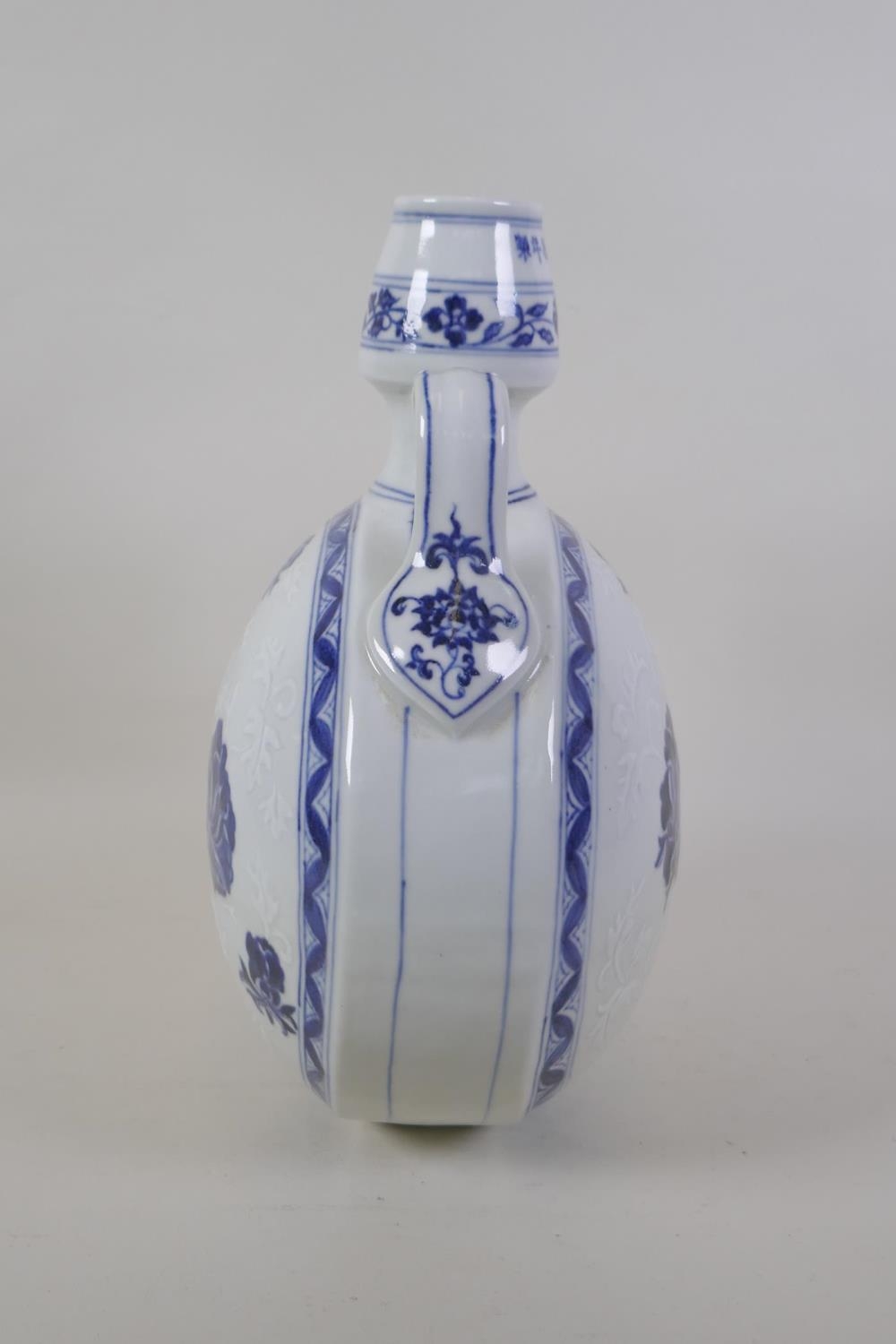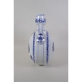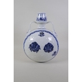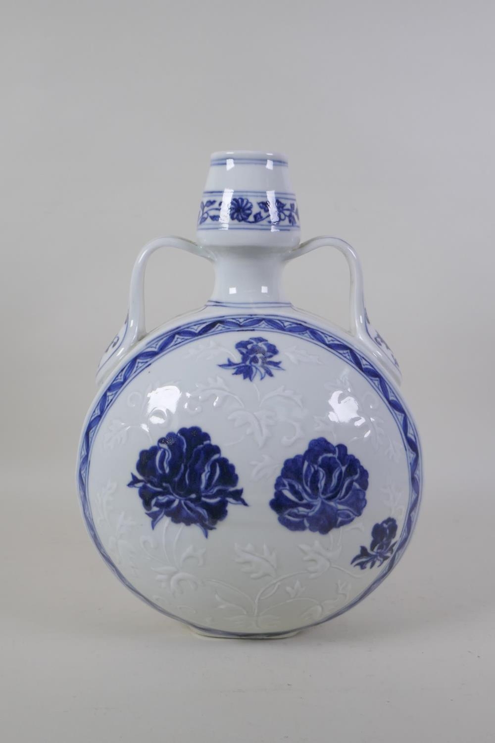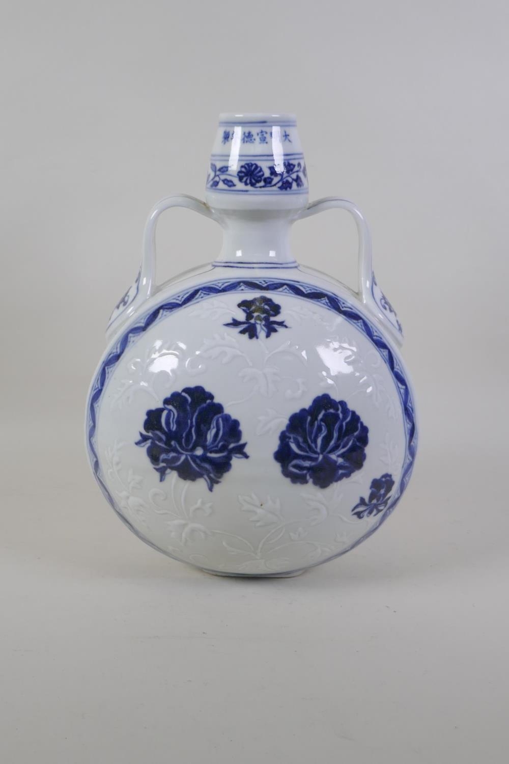 A Chinese blue and white porcelain two handled moon flask with scrolling floral decoration, Xuande 6 character mark to rim, 30cm high