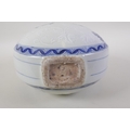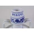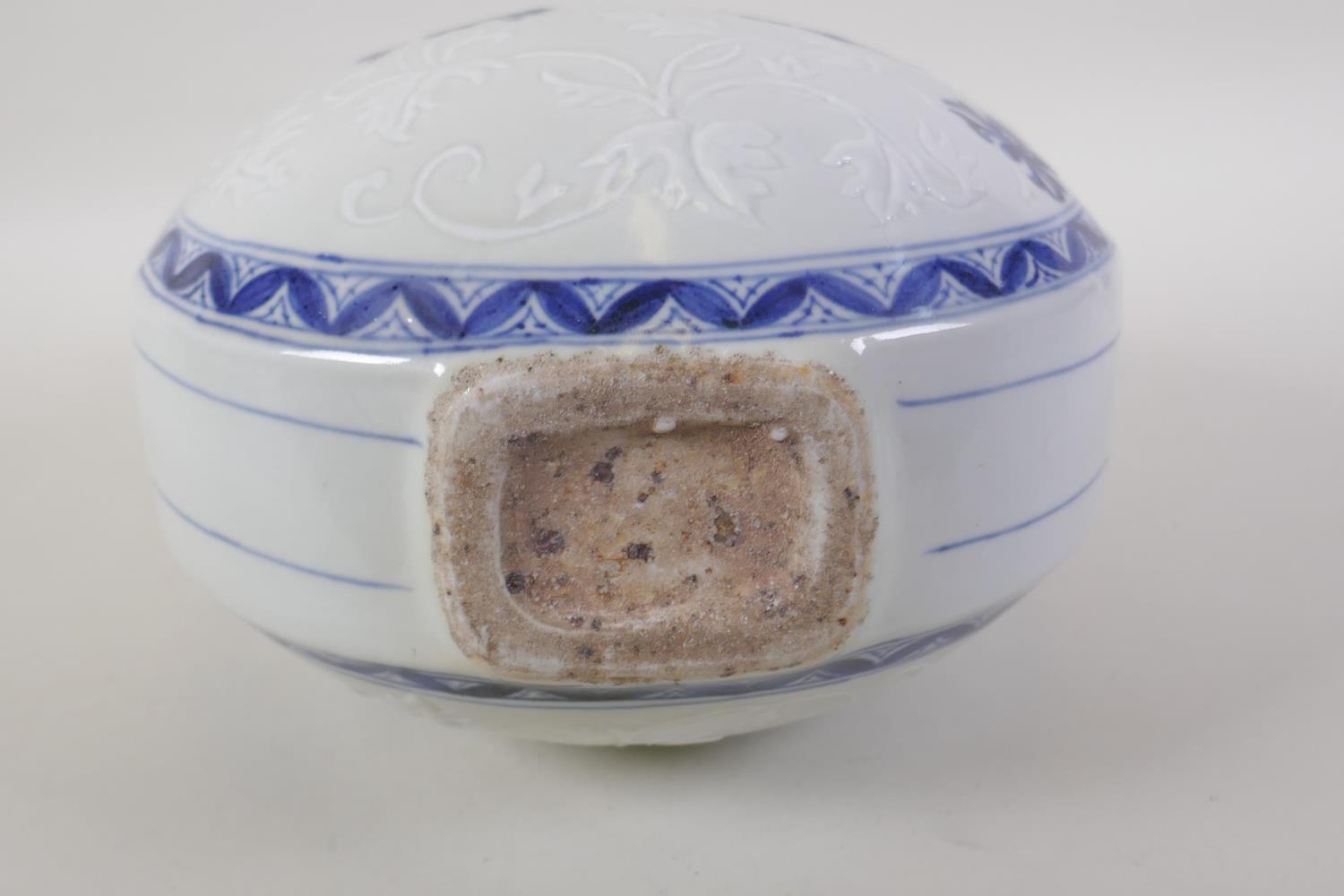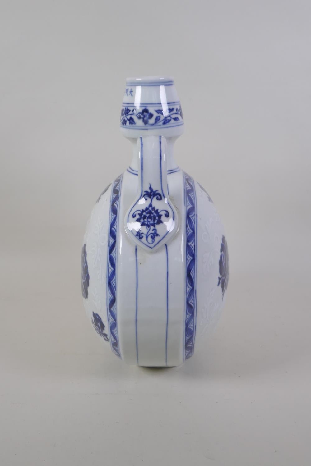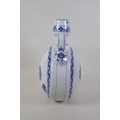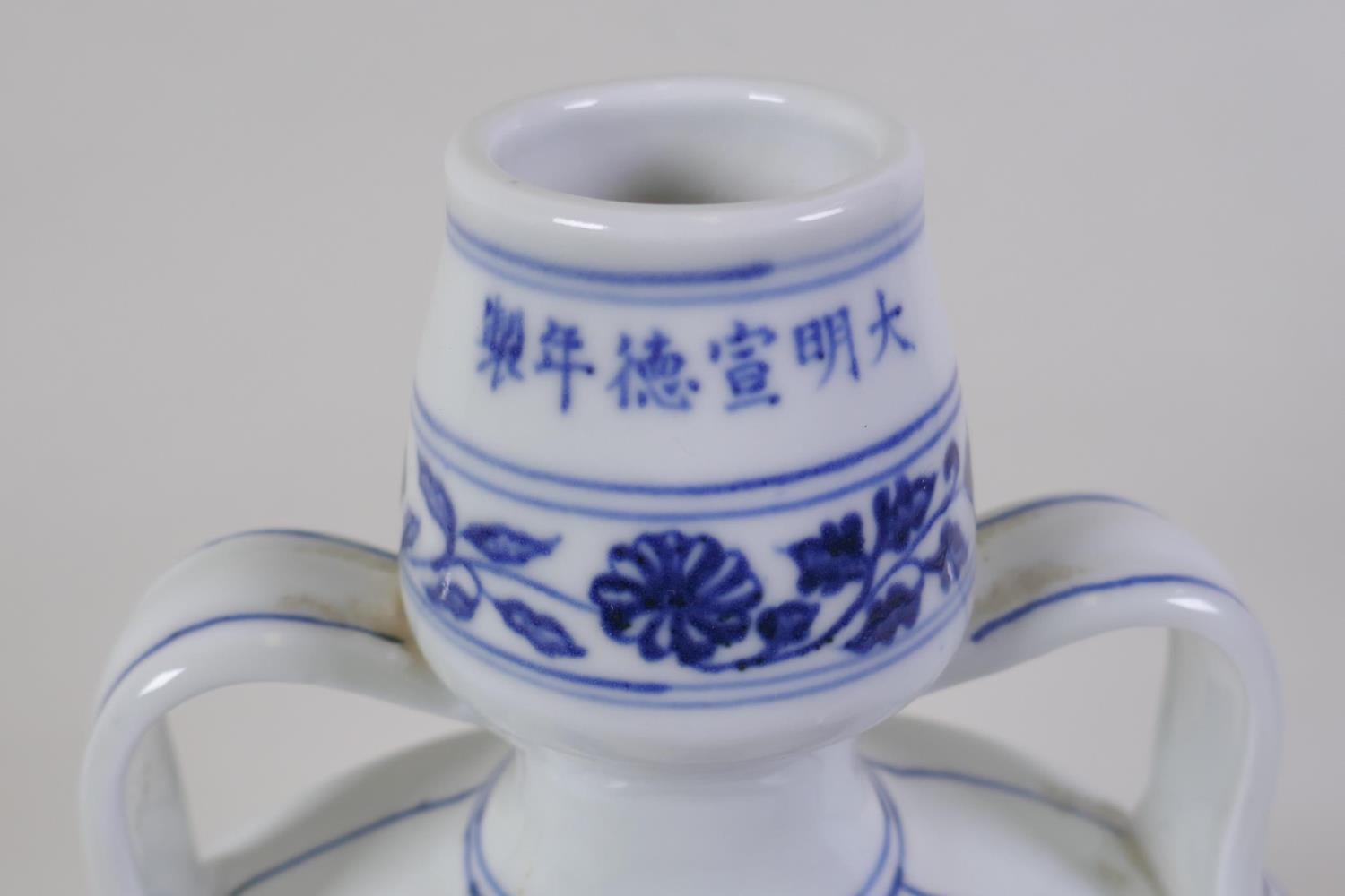 A Chinese blue and white porcelain two handled moon flask with scrolling floral decoration, Xuande 6 character mark to rim, 30cm high