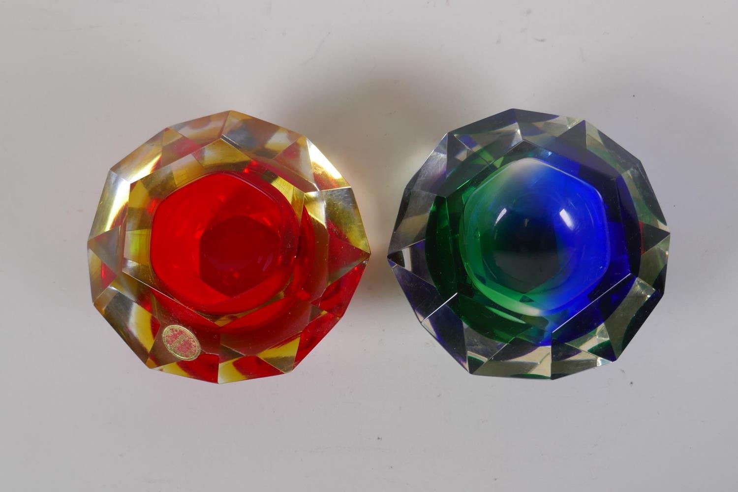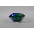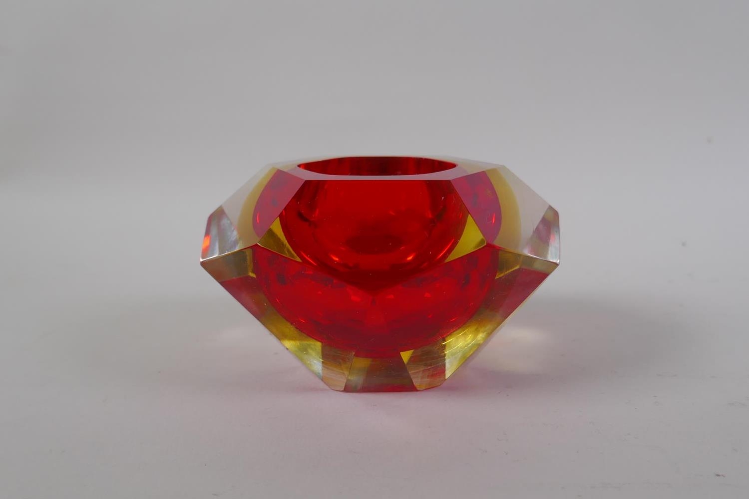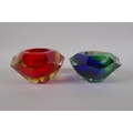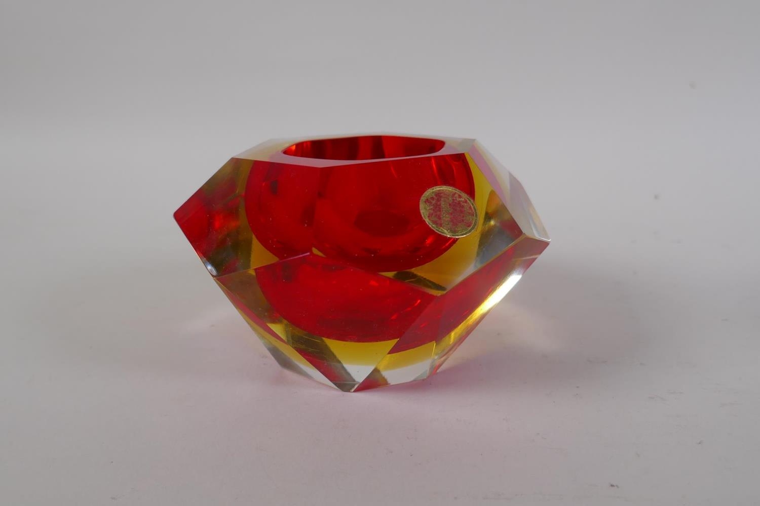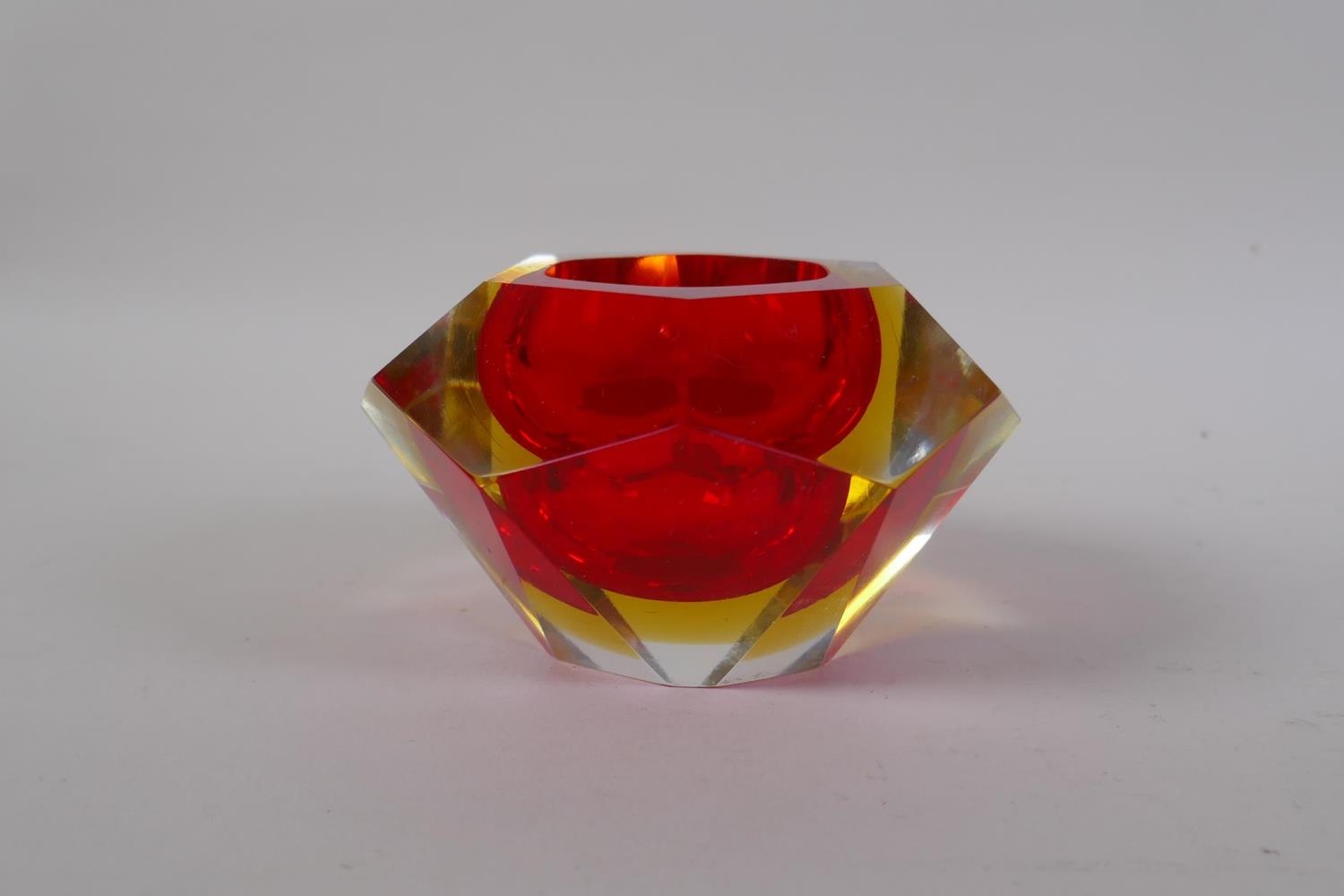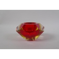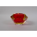An Italian mid century Somerso style diamond shaped orange glass bowl, probably Flavio Poli, and another similar, 12cm diameter
